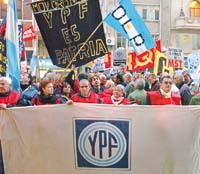 Frente al edificio de Diagonal Norte y Esmeralda, que todavía conserva grabada en su frente la sigla de YPF pero que ahora regentea la española Repsol, centenares de manifestantes reclamaron la nacionalización del petróleo y el gas en la Argentina. En un documento de diez puntos, los convocantes –que van desde agrupaciones sociales, piqueteras y la CTA hasta partidos de izquierda y el ARI– también demandaron la “reestatización de YPF y Gas del Estado sin indemnización”; “creación de una empresa estatal bajo control de sus trabajadores y consumidores”; “derogación de los convenios para explorar y explotar la plataforma submarina”, y la “suspensión inmediata de la exportación de gas y petróleo”. Antes, varios dirigentes que participaron de la marcha se reunieron con el embajador de Bolivia, a quien le manifestaron su adhesión a la decisión de Evo Morales de nacionalizar los hidrocarburos.