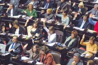 La sesión había sido convocada para las once de la mañana. Una hora más tarde, apenas asomaba un puñado de diputados K en el recinto. Pero el clima distendido hacía presumir que la iniciativa del Gobierno no corría peligro. La oposición comenzaba a agruparse en el Salón de los Pasos Perdidos a la espera de que el oficialismo reuniera su propio quórum. Cerca del mediodía apareció la avalancha de legisladores y Alberto Balestrini abrió la sesión, que llevaría más de siete horas de debate.