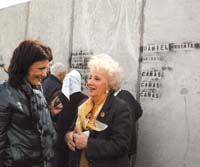 Madres, Abuelas, Familiares y amigos de desaparecidos llevaron adelante el reclamo frente al paredón del predio de Costanera Norte que servirá como cenotafio. Allí dejaron impresos los nombres que deberían aparecer en el monumento una vez finalizada las construcción de las placas que aún deben licitarse. “Norberto Morresi, Alejandro Almeida, Miguel Boitano, Laura Carlotto, Alejandro Gutiérrez” son algunos de los nombres que quedaron plasmados con aerosol negro en el paredón más cercano al Río de la Plata. Las Madres pintaron con esténcil los mismos nombres que llevan bordados en sus pañuelos blancos y sumaban otros mientras buscaban los moldes con las letras para completarlos. A esta tarea se unieron Adriana Magnoli, madre de una de las 194 víctimas del incendio de Cromañón, y Raquel Witis y Dolores Demonty, dos integrantes de la agrupación Madres del Dolor, que nuclea a mujeres que perdieron a sus hijos en casos de gatillo fácil o de abuso policial.