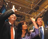 “The president Kirchner will ring the Opening Bell”, adelantaba el tablero de noticias, uno de los cientos de letras luminosas que cruzan el recinto de la Bolsa de Wall Street. Diez segundos antes de las 9.30, Kirchner apretó la campana de la que hablaba el cartel, dando comienzo oficialmente a la rueda bursátil más grande del mundo que mueve la friolera de unos 4 mil millones de dólares al día. La breve pero histórica ceremonia es transmitida en directo por cuatro canales de noticias norteamericanos y queda reservada a personajes representativos, que muchas veces no tienen nada que ver con la política o los negocios. “Agradecemos el gesto del mercado de invitarnos, volvimos al lugar del que nunca debimos haber salido”, sostuvo el Presidente en el desayuno previo a la campana, en el que se reunió con las autoridades de la Bolsa y un grupo de empresarios norteamericanos. Aunque las empresas aguardarían reunirse de manera individual con el Presidente para confirmarlo, el ministro de Planificación, Julio De Vido, comentó que Occidental Petroleum anunció una inversión de mil millones de dólares para incrementar su producción a 50 mil barriles diarios mientras que Cargill prometió otros 330 millones.