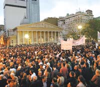 Nadie puede asegurar que entre dos o más gajos de ese abanico, enunciado aquí de manera incompleta, no existan vasos comunicantes y, por las dudas, es una buena respuesta la movilización convocada ayer por Madres y Abuelas de Plaza de Mayo para demandar la aparición con vida de López, no importa cuál haya sido la razón de su ausencia, porque es una manera de contestar a los que pretenden organizar una defensa de la impunidad desparramando miedo sobre la convivencia democrática, queriendo descalificar la búsqueda tenaz de verdad y justicia. Desde un mitin en un pequeño pueblo cordillerano de Chubut, el presidente Kirchner hizo pública su adhesión a esa marcha, una actitud que deberían imitar todos los líderes políticos de la “convergencia plural” y de la oposición. Hay que decir, en verdad, que ayer concurrieron varios intendentes y dirigentes políticos y llegaron adhesiones de algunos partidos con representación legislativa, lo que ya es un paso adelante y muestra las posibilidades futuras. La movilización fue multitudinaria y pese a la variedad ideológica de sus participantes respetaron los principios de la convocatoria: “Buscamos verdad, buscamos justicia, buscamos a Julio”.