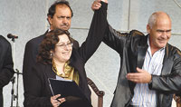 Coincidieron en Cosquín, con el secretario de Turismo, Enrique Meyer, y 8 mil jubilados de testigo. Allí estaban Daniel Scioli y Graciela Ocaña, a quienes algunos K señalan como posibles integrantes de la fórmula porteña. Pero el vicepresidente y la titular del PAMI, que se juntaron con Meyer para la firma de un convenio para los jubilados, se rieron de las especulaciones en el avión que los trajo de regreso a la Capital. Ocaña, se sabe, tiene domicilio en provincia de Buenos Aires y es improbable entonces que se lance a una aventura en otro distrito.