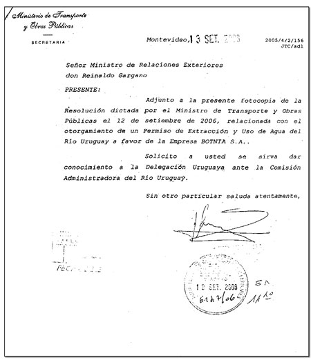 La que se ve en la foto es la comunicación que el Ministerio de Transporte y Obras Públicas uruguayo envió al canciller Reinaldo Gargano para notificarle que había otorgado un nuevo permiso a Botnia para utilizar más agua del río Uruguay. “Solicito a usted que se sirva dar conocimiento a la Delegación Uruguaya ante la Comisión Admnistradora del Río Uruguay” de la decisión, dice la carta dirigida a Gargano. El trámite correcto, según lo establece el Tratado del Río Uruguay, hubiera sido consultar previamente a la Argentina. Ayer, en el gobierno argentino había gran malestar porque Gargano puso en duda la “verosimilitud” de la denuncia sobre esta nueva decisión unilateral del Uruguay, por lo que difundieron el documento.