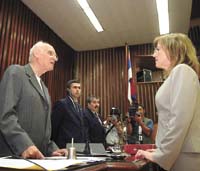 “Y ya lo ve/ y ya lo ve/ es para Rovira que lo mira por tevé”, se escuchaba en la sala. Los simpatizantes del FUD volvieron a la carga para hacerse sentir cada vez que alguno de los convencionales del oficialismo tomó la palabra. Jorge Franco, jefe de Gabinete del gobierno de Rovira, funcionó durante la asamblea como vocero del sector. “Nosotros –dijo– acatamos la voluntad de la mayoría, pero seguimos convencidos de que el gobernador Rovira merece un mandato más para completar su obra de gobierno.” Pero el público no le dio aliento, y toda vez que intentó mencionar algún logro de la gestión del gobierno, su voz terminó ahogada bajo las silbatinas.