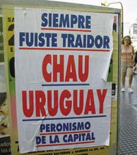 “Siempre fuiste traidor. Chau Uruguay. Peronismo de la capital”, rezaban los carteles que aparecieron ayer en los frentes de distintos edificios en el microcentro porteño. Pocas horas después, desde el PJ porteño repudiaron “la utilización de su nombre y de sus símbolos” en los afiches, que agravian a Uruguay en pleno conflicto por las papeleras. “Nadie se hizo cargo”, comentó el candidato a jefe de Gobierno porteño, Daniel Filmus, sobre la autoría de los carteles, al tiempo que denunció una “campaña sucia” contra el PJ porteño y negó que la agrupación kirchnerista esté involucrada en el episodio.