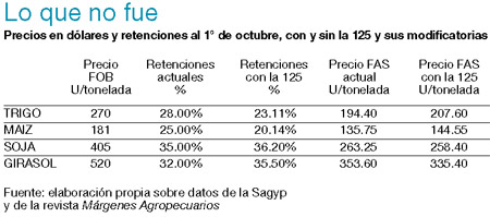 Proyectando todas estas variables la conclusión es que con los precios internacionales del miércoles 1 de octubre los productores de trigo y maíz hubieran pagado retenciones más bajas y obtenido mayores beneficios, mientras los de girasol y soja hubieran debido pagar retenciones apenas superiores a las vigentes (35,5 y 36,2 por ciento en lugar del actual 35 por ciento), como se observa en el cuadro 3.