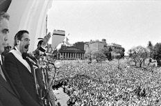 La gloria. Alfonsín entendió mejor que nadie que 1983 no era sólo una oscilación más del péndulo cívico-militar que había mareado siempre a la política argentina, sino el inicio de una era completamente nueva. Tras derrotar internamente al balbinismo liderado por un jovensísimo Fernando de la Rúa, Alfonsín lideró una campaña que, como ninguna desde la de Perón del ’46, logró sintonizar con el clima de época, marcado por el lema de los derechos humanos, la recuperación de la paz y la consolidación de la democracia.