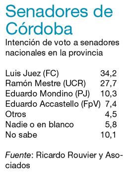 Juez, candidato del Frente Cívico de Córdoba, lleva una ventaja de seis puntos y medio sobre su inmediato perseguidor, el radical Ramón Mestre. Más lejos, en el tercer lugar, aparece Eduardo Mondito, el hombre del gobernador cordobés Juan Schiaretti. Recién en la cuarta ubicación está el Frente para la Victoria, con Eduardo Acastello. Las conclusiones surgen de un trabajo realizado por Ricardo Rouvier y Asociados, que realizó 600 entrevistas a domicilio en Córdoba.