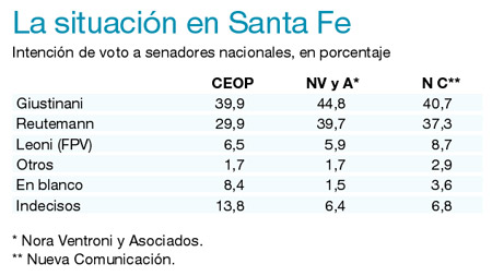De las elecciones del interior del país, la más trascendente parece ser la de Santa Fe, porque allí compiten dos candidatos presidenciales, Carlos Reutemann y Hermes Binner, quien apoya a su postulante a la senaduría, Rubén Giustiniani. De acuerdo con las tres encuestas que hoy publica este diario, Giustiniani estaría al frente, existiendo discrepancias en la distancia. Según señalan casi todos los trabajos, Agustín Rossi retendría su banca en la Cámara de Diputados, aunque hay quien señala que depende del nivel de corte de boleta.