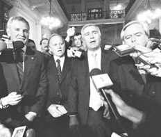Ni pintar por el recinto. Esa fue la decisión del núcleo duro de la oposición ante la votación de la Ley de Servicios de Comunicación Audiovisual que reemplazaría a la vigente desde la última dictadura. El peronismo disidente, Unión-PRO, la UCR y la Coalición Cívica se fueron retirando por tandas e hicieron una conferencia de prensa para cuestionar la votación de la ley, a la que no votaron ni en contra, porque la consideraron “viciada de nulidad”. “Esta es una decisión de toda la oposición”, sonrió Francisco de Narváez. La UCR habló de “extorsión, apriete y condicionamientos” del Gobierno. Luis Barrionuevo y compañía se declararon “en contra de los monopolios”.