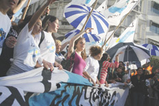 Columnas o manifestantes sueltos van llegando, con pancartas bien trazadas o manuscritas, de a cientos o de a cuatro. Suenan algunos redoblantes, bombas de estruendo aturden al cronista. Dos juezas se acercan, con su atuendo de labor: traje sastre, preeminencia del gris, un pañuelo que pone la nota de color. “No todos pensamos igual”, le comenta una magistrada al escriba. “No cuente que fui yo la que se lo dijo”, agrega apenas en broma. Claro que no se la identificará, su Señoría, basta con consignar el diálogo.