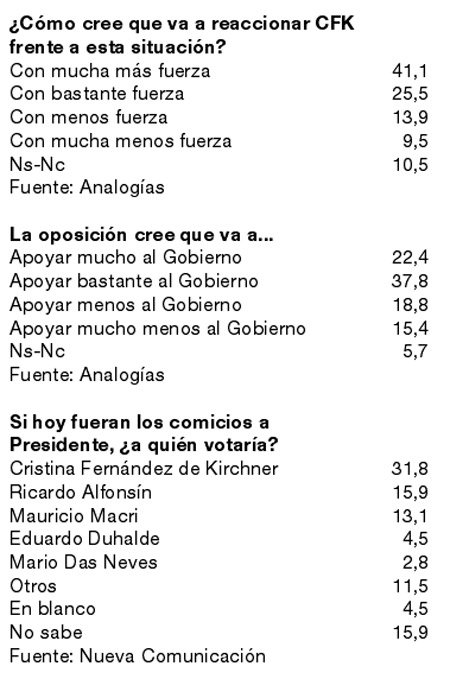 Paralelamente un estudio de Analogías, que lidera Analía Del Franco, concluye que dos de cada tres ciudadanos piensa que la Presidenta superará la difícil situación con fuerza, y un 60 por ciento cree que la oposición apoyará al Gobierno en su gestión.