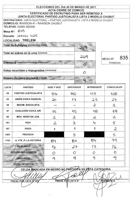Los radiotelegramas que difundieron ayer los apoderados del Frente para la Victoria serían la prueba del “sistema paralelo de recuento de votos” que, denuncian, montó el gobierno chubutense. Allí se ve cómo las planillas, con los detalles de cada mesa, eran remitidas a la “Junta Electoral - Partido Justicialista Lista 2 Modelo Chubut”. Incluso el domicilio consignado, Rawson 41, corresponde a la sede del partido conducido por Mario Das Neves. Desde ese espacio, justificaron el hecho en que “en los pueblos chicos se utiliza frecuentemente” ante la dificultad de implementar otros medios de comunicación, aunque los dos facsímiles que reproduce Página/12 tienen su origen en las ciudades de Trelew y Puerto Madryn.