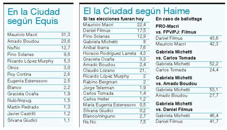 Ya sea llevando a Mauricio Macri o a Gabriela Michetti como candidatos, el PRO encabeza todos los sondeos para las elecciones a jefe de Gobierno porteño de julio, pero en ningún caso se salva de ir al ballottage. Allí, por el momento, le tocaría competir con un kirchnerista, Daniel Filmus o Amado Boudou, con resultado incierto, aunque algunos de los consultores que trabajan con el Gobierno comenzaron a admitir que desbancar al macrismo parece demasiado complicado. Por ahora, Pino Solanas cosecha un lejano tercer puesto, pero los encuestadores consultados no quieren dar un veredicto hasta tanto el líder de Proyecto Sur no anuncie dónde se postulará y pueda medirse la reacción que genere.
