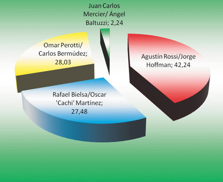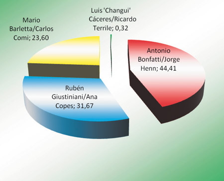 En el peronismo, Aresco adelanta que Rossi conseguiría casi el 22 por ciento, duplicando al segundo, que no sería Bielsa sino Perotti, con el 10 por ciento, y el canciller conseguiría el 9 por ciento.