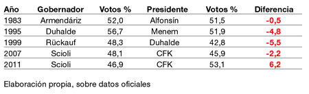 El candidato triunfante a gobernador de la provincia de Buenos Aires obtuvo menos votos que la fórmula presidencial en su distrito. Esto ocurre por primera vez desde que los generales volvieron a sus guarniciones, en 1983. Siempre que ambos cargos se eligieron al mismo tiempo había sido a la inversa. Esto se explica, entre otras cosas, porque el padrón presidencial no incluye a los extranjeros, que sí pueden elegir gobernador. Aun corriendo en ese terreno empinado, en 2011 Cristina invirtió la tendencia. En el año cero de la democracia argentina, Raúl Alfonsín atrajo 0,5 por ciento menos votos que su candidato a gobernador Alejandro Armendáriz; en 1995 Carlos Menem quedó más de cinco puntos atrás de Duhalde; en 1999 Duhalde reunió 5,5 por ciento menos que Carlos Rückauf y en 2007 Cristina quedó 2,2 puntos por detrás de Scioli. El domingo pasado, en cambio, según el escrutinio provisorio, CFK obtuvo el 53,09 por ciento de los votos válidos emitidos para esa categoría y Scioli el 50,24 en la suya, con una diferencia de 3 puntos. Pero en realidad la presidente dejó atrás al gobernador por 6 puntos. Los votos de Scioli no pasaron del 46,9 y fue el ministerio del Interior el que le agregó el 3,3 por ciento que corresponde a Mario Ishii, porque ambos integran la Alianza Frente para la Victoria. Además, CFK obtuvo su porcentaje sobre un padrón de 10,8 millones, es decir 300 mil votantes menos que los 11,1 habilitados para la categoría gobernador, que incluye a extranjeros. Pero el porcentual de Scioli sube porque sus votos se miden sobre 6,9 millones de positivos emitidos y el de Cristina sobre 7,7 millones. Esto se debe a que para gobernador hubo 810.000 votos en blanco y para presidente apenas 457.000. Esta es otra medida significativa del mayor entusiasmo electoral por Cristina que por Scioli. En los análisis habituales se atribuye la ventaja de Cristina a las candidaturas de Ishii, quien compitió con Scioli dentro del FpV, y de Martín Sabbatella, que enfrentó a ambos desde el Nuevo Encuentro. Esta es una verdad a medias: Cristina fue votada por 4.129.046 bonaerenses, esto es 220 mil más que la suma de los que eligieron a Scioli (3.265.285), a Ishii ( 231.662) y a Sabbatella (402.665). La diferencia neta entre Cristina y Scioli es de 900.000 votos, y podría reducirse a 670.000 si los que esta vez optaron por el cazador de traidores de José C. Paz se inclinaran por el leal de Benavídez. Los porcentajes de cada uno son 53,1 por ciento para Cristina frente a 46,9 por ciento de Scioli, con una diferencia de 6,2 por ciento, la más alta desde que se vota en democracia. También son impactantes los resultados de CFK si se los coteja con los de los candidatos a intendente que la acompañaron en la misma boleta. Sólo el de Tigre, Sergio Massa puede jactarse de haber recibido más votos que Cristina. El otro dirigente justicialista que tuvo una actitud hostil hacia la presidente fue José de la Sota. El domingo 7 fue electo gobernador de Córdoba y lo celebró con la fundación del cordobesismo, anunciada como un desafío al gobierno nacional. Los cordobesistas dejaron en libertad a su fuerza para votar por Cristina, a Duhalde o a Rodríguez Sáa. Una semana después, Cristina llegó al 34,2 por ciento, contra 13,7 del puntano y 11,9 del gran timonel de las pampas chatas. Además, la lista de candidatos a diputados nacionales del Frente para la Victoria avalada por Cristina se impuso con el 29,6 por ciento, contra la que auspició De la Sota, que ocupó el sexto lugar, con 6,7 por ciento. Ambos batieron récords: Cristina por la primera victoria justicialista en una elección presidencial en Córdoba desde 1983, y De la Sota como líder del movimiento político más efímero de la historia provincial: el cordobesismo nació el 7 y pasó a mejor vida el 14 de agosto de 2011. Pobre angelito.