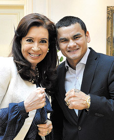 La presidenta Cristina Kirchner recibió ayer en Olivos al boxeador Marcos “Chino” Maidana, en un reconocimiento tras el combate que protagonizó hace dos semanas en Las Vegas frente al estadounidense Floyd Mayweather, en el que perdió por puntos. Maidana –quien llegó acompañado por su preparador Sebastián Contursi, por su madre Olga Martínez y su primo Gustavo Martínez– le llevó a la Presidenta unos guantes de boxeo, que ella se probó.