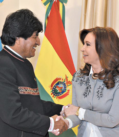 Fernández de Kirchner recibió a Morales y repasaron la situación política de la región. El encuentro fue en el salón Jefatura, donde en general la Presidenta se reúne con los visitantes, así como también con los ministros del gabinete. En el encuentro estuvieron presentes el ministro de Relaciones Exteriores, Héctor Timerman, y el secretario general de la Presidencia, Eduardo “Wado” De Pedro. De la comitiva boliviana fueron parte el canciller David Choquehuanca y el embajador en Buenos Aires, Liborio Flores.