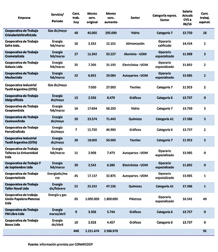 Los jóvenes investigadores del Centro de Ecomomía Política, CEPA, calcularon el costo del tarifazo energético sobre un sector de PYMES en empleos que se pueden perder. La información que procesaron proviene de la Confederación Argentina de Trabajadores de Cooperativas de Producción y Servicios (CONARCOOP). Comprende apenas 18 empresas recuperadas que funcionan como cooperativas de producción industrial (aluminio, vidrio, alimentación, electrónica, autopartes, textiles, papel, gráficos, químicos y plásticos). Para cada uno calcularon el consumo de gas y/o electricidad (el bimestre febrero-marzo en la mayoría y en otros casos el semestre diciembre-mayo, o los lapsos diciembre-febrero, diciembre-marzo o diciembre-abril, según la información disponible en cada caso). Luego consignaron la cantidad de trabajadores de cada una (448 en total) y las facturas de servicios antes y después del aumento, que más que se duplicaron (de 1,2 a 2,5 millones de pesos). Por último, la cantidad de sueldos que el aumento representa (91, según el rubro de actividad de cada una) es decir más del 20 por ciento cuyo empleo entró en zona de riesgo.