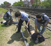–¡Al blanco, al blanco! –grita señalando al rubio mientras agita por el aire un fierro. Aunque no pasa de la intimidación al acto, la víctima de sus amenazas intenta descomprimir la situación pidiendo un trago de cerveza. Es la cerveza que hasta hace poco estaba en el depósito saqueado del copetín al paso del andén. El pedido no tiene éxito. Esa negativa encierra sutiles códigos de pertenencia social. A pasos de ese lugar, otro joven con físico de adolescente –alto y muy flaco– amenaza con golpear a un cronista de Canal 9. “Mis zapatillas salen treinta pesos. ¿Cuántos salen esos zapatos?”, le pregunta con aire indignado. El movilero, que lleva traje, corbata violeta y zapatos de diseño moderno, permanece callado.
