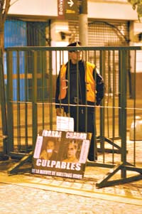 También acomodaron carteles con los retratos de Omar Chabán y Aníbal Ibarra acompañados por las palabras “asesinos” y “culpables”. El decorado estaba completo con unos afiches con la leyenda “Rubro 32. Compra de políticos. Pago en efectivo. Llamar al 0800 Presidencia”. Así, descargaban su bronca contra quien consideran responsable si el juicio político no llegara a realizarse.