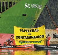 Dos gomones rodearon al buque, uno en proa y otro en popa, para obstaculizar sus maniobras, mientras un grupo de activistas trepaba a la cubierta. Una de ellas, mujer, consiguió llegar incluso hasta el ancla y allí se encadenó. Con esta medida, Greenpeace bloqueó en el puerto de Talcahuano, Chile, un envío de materiales de construcción destinado a la papelera Botnia. Se trata de las mismas estructuras metálicas que, un mes atrás, habían sido frenadas en tierra cuando hubo un intento de cruzarlas en una decena de camiones, que fueron frenados en los puentes de Gualeguaychú y Colón. Como consecuencia de la nueva protesta, esta vez marítima, la salida del carguero se postergó por 24 horas.