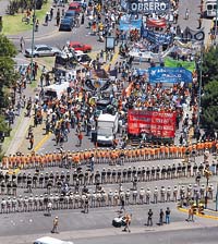 Luego de concentrar frente al Correo Central aguantando el sol con paraguas, protectores solares y gorras, los manifestantes avanzaron sobre la avenida Leandro Alem, fuertemente custodiados por motos de la Policía Federal y carritos de bombón helado. “Hace calor, no se amontonen. Son sólo cinco cuadras”, alertó uno de los organizadores, mientras los tres trompetistas de Los Caprichosos de San Telmo tocaban la melodía de “Los caminos de la vida”, acompañados por tambores y redoblantes. Detrás, la activista travesti Diana Sacayán competía inventando coplas norteñas: “Qué quilombo se va a armar... fuera las papeleras y aire limpio para cantar”. “No queremos ser violentos, vamos a llegar hasta donde las autoridades nos dejen”, advirtió el dirigente piquetero Néstor Pitrola desde la cabecera de la marcha, que compartió con Vilma Ripoll del MST, Martín Saboulard de la Asamblea de San Telmo y Fabiola Ferro del gremio docente de la UBA. A un costado, el heladero José Cayún afirmó que desde el 2001 sólo trabaja en los piquetes y las marchas. “Empecé en La Matanza, cuando veías codo a codo a Castells, D’Elía y Alderete”, recordó el responsable de aminorar la sensación térmica, quien adelantó un corte en la Avenida de Mayo para el próximo martes porque “nos quieren sacar la licencia de los carritos”.
