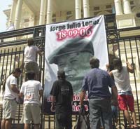 Ayer hubo actos en todo el país, como los que organizaron las Multisectoriales de La Plata, Rosario, Mar del Plata y Jujuy, entre otras localidades. Una gigantografía con la imagen de López fue colgada de las rejas de la Casa de Gobierno platense “para que los funcionarios no olviden ni se amparen en el silencio” (foto). Y en breve agregarán un “contador” para llevar registro de los días transcurridos desde su desaparición. “Ya pasaron 30 años, Kirchner dice nunca más, pero el compañero López no se sabe dónde está”, retumbó en la estación de Once. Allí se reunieron los delegados del Astillero Río Santiago, Garrahan, Zanon, Subte, LAN, Hospital Francés, Hospital Ramos Mejía, ferroviarios del Mitre y Sarmiento, IOMA-ATE, Fresenios Medical Care y agrupación Violeta de Foetra y leyeron el documento por la aparición de López y por el “desprocesamiento de los luchadores”.