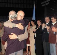 “Si no existieran las escuelas, se perdería buena parte de la memoria, y todos conocemos que las Malvinas son argentinas porque las escuelas lo transmiten todos los días”, aseguró ayer por la tarde el ministro de Educación, Daniel Filmus, durante el homenaje en el Salón Blanco del Palacio Sarmiento. El candidato a jefe de Gobierno porteño explicó que no importan las fechas, sino poder transmitir un “sentimiento para perpetuar para siempre esta demanda de los argentinos. No vamos a negociar jamás la soberanía de las islas Malvinas”. El acto comenzó con el ex combatiente Sergio Vainrog al piano tocando el Himno Nacional, tal como lo hiciera en el salón del buque inglés “Camberra” que lo trasladó a tierra junto a otros tres argentinos al finalizar la guerra. Vainrog contó que se atrevió a tocar el Himno e hizo que sus compañeros entonaran la canción patria, hasta que un oficial inglés lo golpeó en la cabeza. El acto continuó en la plazoleta del Pasaje Pizzurno donde los ex combatientes izaron la bandera en el mástil que está ubicado en la entrada de la cartera educativa. “Me parece que el trabajo que hacen los ex combatientes para que la memoria esté presente día a día es un trabajo fundamental, no existe un país sin memoria. Si uno no sabe de dónde viene, no sabe a dónde va”, comentó Filmus, quien lanzó un programa nacional –que el año pasado trabajó los 30 años de golpe de Estado– para que 10 millones de chicos trabajen el tema de los 25 años de la guerra, “pero en especial por qué las Malvinas son argentinas y hay que seguir peleando por su soberanía”. “La memoria tiene que ser algo permanente en las escuelas”, aseguró al terminar el homenaje.
