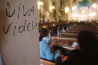“Viva Videla.” La frase, escrita en marcador, fue hallada por el cura párroco Carlos Saracini en el interior de la Iglesia de la Santa Cruz, en San Cristóbal, donde el domingo pasado se celebró una misa por el asesinato del padre Carlos Mugica. De la puerta de ese templo fueron secuestrados un grupo de familiares de desaparecidos y Madres de Plaza de Mayo en diciembre de 1977, a partir de la infiltración del represor Alfredo Astiz. Saracini, quien descubrió el hecho ayer por la mañana, señaló que se trató de “un atentado, una manera oculta de presionar que nos duele; nos han profanado la casa”, pero aseguró que “esta provocación no nos achica” y ratificó la misa que se realizará el viernes en homenaje a las Madres de Plaza de Mayo. La agresión fue repudiada por dirigentes de derechos humanos y por el secretario de Culto, Guillermo Oliveri.
