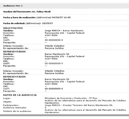 En el encuentro con Ferraro, la agenda señala que hicieron un “análisis de la coyuntura económica regional en general y del proceso de crecimiento argentino en particular”. La audiencia con Bianchi tuvo que ver con “informar a la señora ministra sobre la situación por la que atraviesa” la Comisión Nacional Protectora de Bibliotecas Nacionales. Por último, la reunión con March tuvo como objetivo el “análisis de las alternativas para el desarrollo del Mercado de Créditos Hipotecarios”. Todas fueron en el quinto piso del ministerio, en el despacho de Miceli.