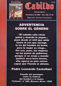 Pese al palabrerío pseudofilosófico –al parecer, para ser nacionalista católico argentino hay que escribir como un inmigrante andaluz– queda en claro que a Cabildo lo que le molesta realmente del último “vómito electoral” es que se haya votado a una mujer. No es un caso de simple machismo sino una oposición irreductible, ya que una mujer al mando es cosa antinatural, perversa y pervertida. Para mostrarlo, la revista le dedica su contratapa a una “payada” de 1939 del jesuita Leonardo Castellani, prolífico historiador y ensayista que sólo encontraba objetable del fascismo esa manía de hablar de las masas y no someterse al Papa. Escribió Castellani y festeja Cabildo: