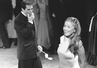 Recio y seguro de sí mismo, el Romeo que interpreta Guillermo Fernández irrumpe en el bar donde lo esperan sus amigos Mercucio y Benvolio, cantando un previsible “Cafetín de Buenos Aires”, para luego internarse en las quejas de un amor perdido que, se sabe, echará al olvido apenas conozca a la hija de los Capuleto. Cerrada la escena del bar, el compás del 2x4 deja paso a unos aires criollos y al entorno doméstico de la ropa colgada y por planchar de una casa del barrio. Esta es la referencia musical que prefiere Julieta (una Florencia Peña desenvuelta y entonada) para dar a conocer a la platea toda su efervescencia adolescente. A un paso del baile donde conocerá a Romeo, la chica encontrará en la fiel ama no solamente una cómplice para sus citas galantes, sino también una consejera de ley al momento de exigirle a Romeo las formalidades del caso antes de la consumación del amor.