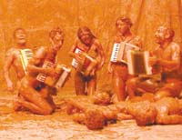 –El Wiener Festwochen nos propuso producir una obra y nos dio a leer La noche italiana, de ödön von Horvarth, un material que, aunque tiene que ver con el pensamiento progresista, no nos interesó. Como siguieron insistiendo, luego de algunas conversaciones surgió el nombre de Kraus.Nosotros conocíamos el texto y enseguida aceptamos porque pensamos que una obra que tiene mil y pico de personajes es pertinente a nuestro “mundo Periférico”: es una obra que lleva implícito un monstruo y necesita una adaptación. Así que la dividimos en dos partes: la primera tiene un clima de posguerra o post-humanidad, pero con un formato humorístico. La llamamos “Opereta apocalíptica e hidrocefálica”, en referencia a la idiotez que manifiestan los personajes de Kraus. Por otra parte, encontramos que la opereta (un género ingenuo y muy popular en Austria) tiene un estilo de música en el que, al primar el sonido del acordeón, nos permitía incluir al bandoneón como un sonido afín. Para “White room”, la segunda parte, el espacio se renueva y aparecen personajes que pueden ser sobrevivientes en un bunker o seres destinados a pruebas de laboratorio. Sobre ellos actúan unos personajes que parecen seres extraterrestres o una especie de Big Brothers orwellianos que obligan a todos a hablar en inglés.