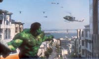 Pocos resabios hay del ballet sentimental de El tigre y el dragón en el drama de Hulk. Aquí los hechos no fluyen sino que pesan. Es la gravedad de cada recuerdo la fuerza que mueve la acción en un film que cae todo el tiempo dentro de sí mismo, para tomar aliento y seguir avanzando en el tejido de su red dramática. Que recién cuando está lista se permite entonces el gran salto hacia la simplificación del monstruo lanzado a su patio de juegos cinematográfico, la golosina inevitable de todo fanático del videojuego, en el que Hulk vuela a los saltos, pelea contra tanques, helicópteros y hasta llega hasta la cima del mundo colgado a un avión de guerra. Si en el centro de todo film de Ang Lee yace “un conflicto entre la obligación social y la libertad personal”, como él mismo dijo varias veces, la única libertad posible en Hulk es verde. Y siente el viento en la cara, o estalla de rabia. “¿Sabés lo que más me asusta? Que cuando pierdo totalmente el control, me gusta”, confiesa el sentimentalmente estreñido Bruce, que irá hacia su chica primero, y luego se enfrentará con su padre en un increíble final épico, una huida hacia delante que encierra las únicas escenas realmente de superhéroes (griegos) de toda la película.