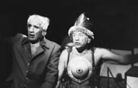 Es difícil imaginar que el general romano Cayo Marcio, de sobrenombre Coriolano, recreado aquí por Eduardo Pavlovsky, pueda ser alguna vez héroe de una epopeya. Sin embargo, el recorrido que ese personaje realiza en esta puesta lo instala casi a la manera de una figura-símbolo capaz de impulsar una utópica gran marcha en aras de un cambio social. En principio, lo que se muestra es una dependencia enfermiza respecto de su madre, una Volumnia autoritaria y socarrona compuesta por el actor y director Norman Briski, quien a su vez subraya esa faceta edípica con humor descacharrante. Se lo ve pintarrajeado de modo grotesco y tan posesivo como la idische mame de un film de Woody Allen: aquél en que la mujer lo amonesta desde el cielo. En este caso, Volumnia aparece encaramada en lo que podría ser una torre romana, señalando a su hijo el camino a seguir. Esta dependencia es sólo uno de los varios rasgos que apartan a esta obra del drama histórico Coriolano, de William Shakespeare, que según Pavlovsky inspiró este espectáculo. El universo guerrero es aquí tan chirriante y disparatado como los elementos escenográficos utilizados. Inventos “caseros” que permiten conducir la historia por diferentes coordenadas históricas y espaciales.
