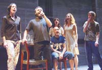 Para el fragmento de la Cantata Santa María de Iquique, se eligió con buen criterio un acompañamiento de botellas sopladas, que aportan una sonoridad que remite a los sikuris. En otros segmentos, otros sonidos –rumores de piedras, el repiqueteo de una máquinade escribir– alternan con gorgoteos y otros apuntes grabados que toman por asalto al espectador desde diferentes ángulos, merced al sonido cuadrafónico. Si la ironía asoma en Flor arrancada (la marcha fue compuesta en ocasión de la muerte de Lenin, pero para la ocasión se eligió un burlón registro jazzeado) no se trata más que de un juego inocente. En ningún momento el espectáculo se propone parodiar épocas ni convicciones. Del mismo modo, el montaje toma distancia de lo que pudiera confundirse con una actitud nostálgica o progre. Tal vez, lo que más llama la atención –y no sólo del entramado del espectáculo sino de la dirección musical– sea la voluntad de trabajar a favor de la emoción, algo poco común en las propuestas de los llamados nuevos dramaturgos.