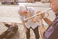 Cuando llega el momento de las fotos parecen tres chicos que aprovechan un descuido de los padres para juntarse a hacer monerías. Se entusiasman con una pose y otra para la cámara, actúan cada papel. Bailan y se cargan con los “pasitos de club” que recuerdan haber seguido de jóvenes. El encargado de la música es Fats Fernández, que cierra los ojos y toca la trompeta con el mismo sentimiento que si estuviese frente a un teatro repleto. De fondo, el riachuelo de Vuelta de Rocha, cargado de barcos y grúas, aparece como un fondo adecuado para la escena. La charla se desarrolla en el bar Roma, a pocos metros de allí, que a esta altura es como la oficina de Fats, orgulloso ciudadano de La Boca.