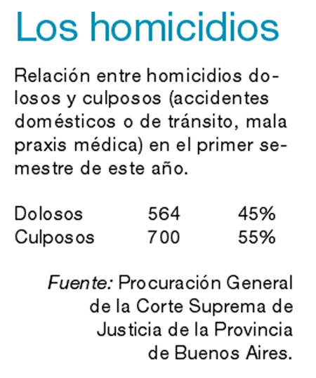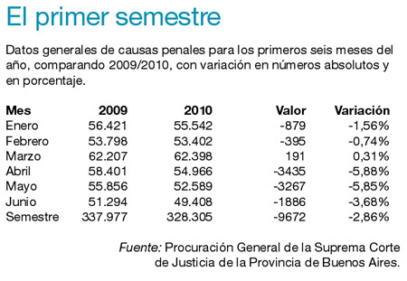 La cantidad de denuncias por delitos cometidos en territorio de la provincia de Buenos Aires disminuyó en alrededor de un tres por ciento durante el primer semestre del año, en comparación con igual período del año pasado, según un informe dado a conocer por la Procuración General de la Suprema Corte de Justicia bonaerense. De acuerdo con esos datos, en los primeros seis meses de 2010 se denunciaron 328.305 delitos, mientras que en igual período del año pasado la cifra registrada había sido de 337.977. Esto significa que se iniciaron 9762 causas penales menos que el año anterior, lo que constituye una baja del 2,86 por ciento. Uno de los datos más importantes es que los homicidios, en los primeros seis meses de este año, disminuyeron un 5,96 por ciento respecto de igual período del año anterior, dado que pasaron de 604 en 2009 a 568 en 2010. De esas cifras totales de homicidios, se aclara que en 2010 sólo el 21 por ciento (126 muertes) pueden atribuirse a la “inseguridad”, porque ocurrieron en ocasión de robo o en concurso con otros delitos.