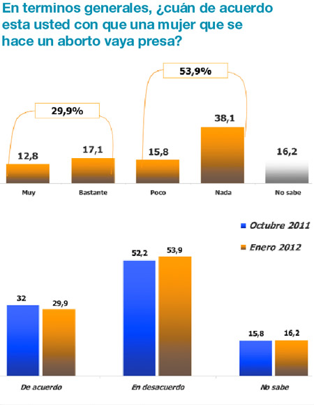 - Unicamente el 31 por ciento de los consultados considera que el aborto debe ser castigado con prisión. La nueva medición muestra que esta posición se redujo levemente.