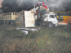 Al menos treinta heridos, dos de ellos de gravedad, fue el saldo de un choque múltiple del que participaron dos ómnibus, tres camiones y dos automóviles, en la Ruta Nacional 11, en proximidades de la ciudad santafesina de Vera. El siniestro se produjo en momentos en que en la zona había una densa niebla, a lo que se sumó el humo provocado por varios hornos de carbón vegetal situados en proximidades de la carretera, por lo que la visibilidad era casi nula cuando, alrededor de la 1.30 de ayer, se registró el impacto en cadena. Ocurrió a la altura del kilómetro 718,500 de la Ruta 11. Del choque participaron un micro de la empresa El Práctico que se dirigía hacia al norte, rumbo a Reconquista, Santa Fe; otro de la compañía Crucero del Norte, que también iba en dirección Sur-Norte, hacia la localidad de Calchaquí, también en esa provincia; un camión jaula, otro cisterna y un tercero de carga general, a lo que se sumaron dos automóviles.
