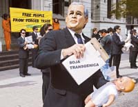 El informe integra la campaña por la biodiversidad de Greenpeace: según la organización, la multinacional Monsanto logró a partir de 1996 que los agricultores argentinos reemplazaran el maíz, el girasol, el lino y el arroz por plantaciones de soja que en la actualidad ocupan la mitad de la superficie cultivable en el país. “Sólo Estados Unidos y la Argentina cuentan con el 90 por ciento de los transgénicos sembrados en el mundo”, afirman. Ayer, 25 activistas disfrazados de lobbistas protestaron frente a la Secretaría de Agricultura para que en la V reunión ministerial de la OMC –que comenzará mañana– la Argentina retire su apoyo a la demanda de los Estados Unidos contra la Unión Europea por su moratoria al ingreso de cultivos transgénicos.