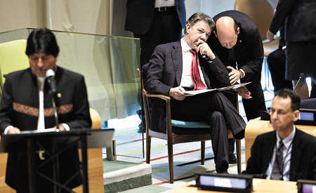Los mandatarios latinoamericanos de las principales naciones productoras de cocaína –el peruano Ollanta Humala, el colombiano Juan Manuel Santos y el boliviano Evo Morales– tomaron la palabra en la última jornada de la sesión especial de la Asamblea General que arrancó el martes pasado.