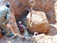 Sin embargo, detalló Vesconi, “al profundizar el trabajo y separar los laterales empezaron los problemas con la napa de agua”. “Se nos inundaba todo y tuvimos que recurrir a las bombas de achique que nos trajo la municipalidad. Nunca nos pasó tener tanta agua, las paredes se nos colapsaban y las tareas se hacían muy dificultosas. A las nueve de la noche del sábado abandonamos los trabajos porque estábamos con la iluminación de las camionetas que nos servían de soporte. Nos fuimos el sábado por la noche sin saber todavía que tamaño tenía el meteorito”, recordó.