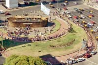 Militantes de Greenpeace instalaron, frente al Obelisco, un “arca de Noé” de 30 metros de largo, para ilustrar “las consecuencias del cambio climático, que provocará millones de refugiados ambientales”: en su interior hay una muestra que empezó a ser visitada por centenares de personas.