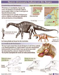 Una especie de dinosaurio hasta ahora desconocida, cuya particularidad es haber tenido una mandíbula cuadrada y pico a los costados, fue hallada en la provincia de Río Negro por un equipo de paleontólogos del Museo Argentino de Ciencias Naturales y el Conicet. Los huesos pertenecieron a un saurópodo joven, de unos nueve metros y largo cuello. Fueron encontrados en el paraje La Bonita, una zona fosilífera situada cerca del Cerro Policía, en el noroeste de la provincia de Río Negro. Como guía de los exploradores intervino una anciana, quien hace más de 80 años guió a los primeros exploradores que recorrieron la zona y hallaron los primeros restos fósiles.