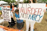Los alrededores del sanatorio Pinellas Park, de Florida, donde está internada la mujer de 41 años, fueron rodeados por personal policial y de seguridad privada para evitar que algún manifestante intentara ingresar al centro sanitario y revertir de alguna manera la decisión resuelta en la quinta instancia judicial, a la que recurrieron los familiares que pretenden mantenerla viva conectada a la sonda que la alimenta y mantiene hidratada. En las calles, decenas de personas se reúnen desde hace días para rechazar el pedido del esposo de Terri, Michael Schiavo, quien asegura que su mujer le había dicho que no la mantuviesen artificialmente si algún día caía en coma. Por el contrario, apoyan el pedido de “clemencia” de los padres, cuyo argumento central presentado ayer ante la Corte Suprema sostuvo que, a raíz de su estado, Terri es víctima de una violación de los derechos constitucionales y de su libertad religiosa.