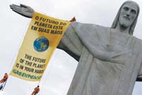 Militantes de la filial brasileña de Greenpeace colgaron una gran pancarta con la leyenda “El futuro del planeta está en sus manos” en uno de los brazos del Cristo Redentor de Río de Janeiro. Dos de ellos quedaron colgados de la enorme bandera y suspendidos en el aire. Al bajar de la famosa estatua, los seis miembros de la organización terminaron detenidos por la policía.