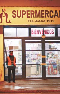 Ayer, el supermercado chino parecía haber quedado detenido en el momento del asalto. A pesar de tener su puerta enrejada cerrada y con una faja del Juzgado Criminal de Instrucción 6, adentro todo estaba como en la noche del sábado. Un paquete de vainillas y un envase de quitaesmalte que alguna clienta dejó en el apuro seguían depositados en una de las cajas. Al lado de una banqueta que cayó en la pelea entre el asaltante y el policía yacían guantes de látex, un paquete de gasas abierto y una mancha desangre que alguien trató de limpiar con un trapo. No eran pocos los que se acercaban a ver. “¿Qué pasó?”, preguntaban los desinformados. “Hubo un asalto anoche, señor”, informaba el policía de consigna a los curiosos que no dejaban de mirar la escena.