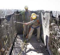 Los soldados riegan las paredes para que después los golpes no levanten tanta polvareda. No hay demasiado equipamiento: además de las mazas, hay dos pequeños vehículos, mezcla de martillo hidráulico y pala excavadora. En las paredes aún pueden verse las perforaciones donde iban a ser colocadas las minicargas de gelamonita, que harían derrumbar la mole de cemento en apenas 4,7 segundos, como estaba planeado, según explica uno de los responsables del Batallón de Ingenieros 601.
